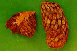 呈倒圆锥形而稍弯曲,上端钝圆或截形,下端较尖,外表黄棕色至黑棕色,密被排列整齐的叶柄残基及鳞片,并有稍弯曲的须根。叶柄残基呈扁圆柱形,质硬。剥去叶柄残基,可见根茎,质坚硬。时柄残基或根茎的横断面呈棕色或深绿色,有黄白色长点状维管束5-13个,排列成环。气特殊,味初微涩,渐苦而辛。
