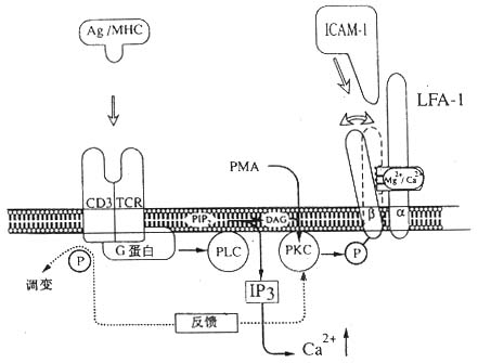 注:抗原与TCR/CD3复合物结合后激活磷脂酶c,催化PIP2水解为IP3和DAG,引起LFA-1分子β链的磷酸化,使LFA-1分子构型发生变化,提高与配体结合的亲和力。CD3分子的磷酸化引起TCR/CD3复合物的调变,导致PKC水平下降,使LFA-1分子β链去磷酸化转变为非活化状态而产生去粘附作用。