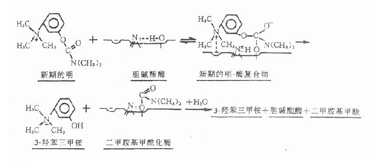 【作用机制】新斯的明能可逆地抑制胆碱酯酶,表现乙酰胆碱的M和N样作用。其结构中的季铵阳离头以静电引力与胆碱酯酶的阴离子部位结合,同时其分子中的羰基碳与酶的酯解部位丝氨酸羟基形成共价键结合,生成胆碱酯酶和新斯的明复合物。由复合物进而裂解成的二甲胺基甲酰化胆碱酯酶的水解速度较乙酰化胆碱酯酶的水解速度为慢,故酶被抑制的时间较长,但较有机磷酸酯类为短,故属易逆性类。二甲胺基甲酰化胆碱酯酶水解后,形成二甲胺基甲酸和复活的胆碱酯酶,酶的活性才得以恢复(图7-2)。