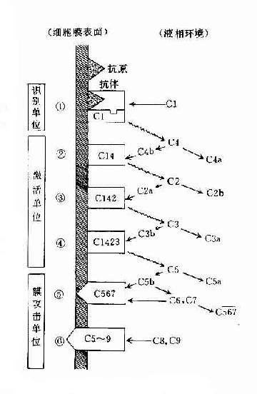 参与补体经典激活途径的成分包括C1~C9。按其在激活过程中的作用,人为地分成三组,即识别单位(Clq、Clr、Cls)、活化单位(C4、C2、C3)和膜攻击单位(C5~C9),分别在激活的不同阶段即识别阶段、活化阶段和膜功击阶段中发挥作用。