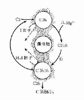 C3在两条激活途径中都占据着重要的地位。C4是血清中含量最多的补体成分,这也正是适应其作用之所需。不论在经典途径还是在旁路途径,当C3被激活物质激活时,其裂解产物C3b又可在B因子和D因子的参与作用下合成新的C3bBb。后者又进一步使C3裂解。由于血浆中有丰富的C3,又有足够的B因子和Mg2+,因此这一过程一旦被触发。就可能激活的产生显著的扩大效应。有人称此为依赖C3Bb的正反馈途径,或称C3b的正反馈途径(图3-5)。