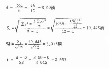 (3)求样本统计量平均相差数d、差数的标准差Sd、标准误Sd及检验统计量t值。