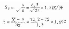 (3)求样本均数X、标准差S及标准误Sχ并进而算出检验统计量t。现已知X=74.2次/分,S=6.5次/分,只要求出Sχ及t值即可。