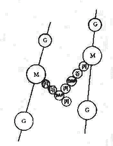 革兰氏阳性菌例如葡萄球的四肽侧链氨基酸由D-丙-D-谷-r-L-赖-D-丙组成。初合成的肽链末端多一个D-丙氨酸残基。肽桥是一条5个甘氨酸的肽链,交联时一端与侧链第三位上赖氨酸连接,另一端在转肽酶的作用下,使另一条五肽侧链末端D-丙氨酸脱去,而与侧链第四位D-丙氨酸连接。从X光检查可见肽聚糖的多糖链是一条较硬而又呈螺旋状卷曲的长杆,由于其呈螺旋状,连接在其上的肽链才伸向四方,使交联受到一定了限制,只有邻近的肽链才可交联。但葡萄球菌的肽桥较长,有可塑性,使远距离的肽链间也可交联,交联率达90%,形成坚固致密的三维立本网状结构(图2-4)。