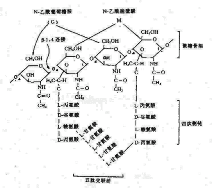 图2-4 金黄色葡萄球糖细胞 壁的肽聚糖结构 |