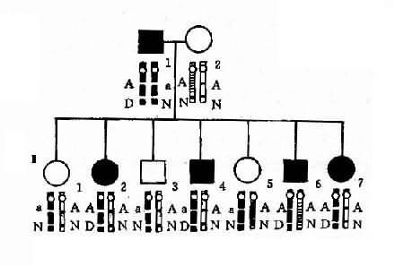 图7-3表示某一致病基因与一多态位点的关系。父(Ⅰ1)是显性遗传病患者,基因型为DN,他妻子(Ⅰ2)正常,基因型为NN,多态标记位点父为Aa,母为AA,在子代中,除Ⅱ4外,都是致病基因与多态标记位点的完全连锁,即都遗传了父亲的A基因和D基因,或是a基因和正常N基因。据此信息,就可确证父亲的致病基因是多态标记A基因连锁在同一染色体上,而Ⅱ4则是重组体,而具有标记基因A的个体并不都是患者,Ⅰ2就是这样,所以,在连锁分析中,多态标记是极为有用的。
