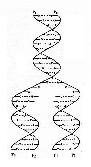 图3-4 双螺旋DNA半保留复制过程P1,P2:DNA亲链;F1,F2:DNA子链;