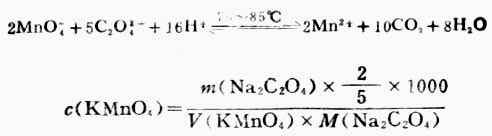 称取约0.86g KMnO4加蒸馏水配成500ml0.01mol·L-1的标准溶液。加热至沸,并保持微沸约1h。冷却,放暗处约一周后用垂熔玻璃漏斗或玻璃丝过滤。将滤液移至棕色瓶内暗处保存。