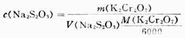 (2)标定Na2S2O3标准溶液浓度 准确称取约0.15g在130-140℃烘干的分析纯K2Cr2O7,加水溶解后加过量KI和一定量的硫酸,加水稀释至约100ml。用待标定的Na2S2O3溶液滴定至呈黄绿色后,滴加淀粉指示剂,继续滴之下至溶液蓝色消失而呈亮绿色为止。根据下式计算溶液的浓度: