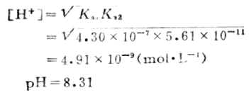 这时的溶液为H2CO3的饱和溶液,在通常的情况下为0.04mol·L-1,则第二化学计量点时溶液的[H+]为: