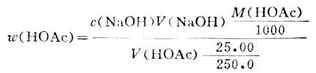操作步骤:用移液管吸取Vml食醋置于250ml容量瓶中,用蒸馏水稀释至刻度,充分摇匀。再用移液管吸出25.00ml放在250ml锥形瓶中,加酚酞指示剂2滴,用NaOH标准溶液滴定,不断振摇,当滴至溶液呈粉红色且在半分钟内不退色即达终点。重复操作2-3次,按下式计算食醋中HOAc的质量分数。