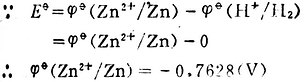 因为Zn 2+│Zn电极的电位为负值,低于标准氢电极的电位。所以Zn 2+│Zn是极为负极,标准氢电极为正极。其电极反应和电池反应为: