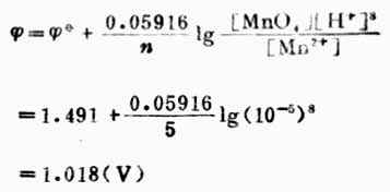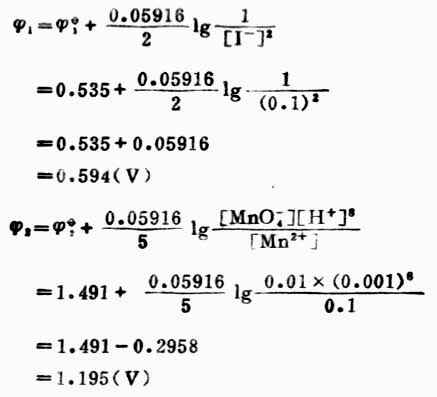 计算结果表明,[H+]降低,对应的氧化型物质(MnO4-)的氧化能力降低。