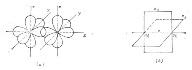 例如在N2分子中,氮原子的电子层结构为1s22s22p1x2p1y2p1z三个未成对的p电子分占三个互相垂直的p轨道。当两个氮原子结合成N2分子时,px电子云沿x轴方向以“头碰头”方式重叠形成一个σ键,每个原子剩下的两个p电子云不能再沿x轴方向“头碰头”重叠,只能让p电子云的对称轴平行,以“肩并肩”方式重叠形成两个π键。如图4-10。