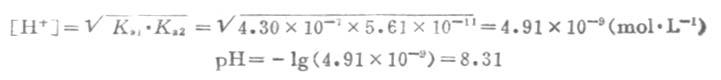 例4 计算0.10mol.L-1 NaHCO3溶液的pH值。已知H2CO3的Ka1=4.30*10-7,Ka1=5.61*10-11。