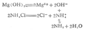 由于溶液中生成了弱电解质NH3和H2O,使[OH-]减小,溶液中[Mg2+][OH-]2<Mg(OH)2的Ksp,使平衡向Mg(OH)2溶解的方向移动。若有足量铵盐,沉淀可以完全溶解。