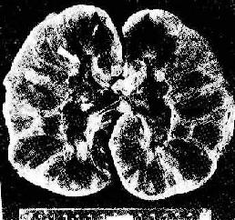(2)血管型排斥反应:主要为抗体介导的排斥反应(CMC,ADCC和免疫复合物形成),往往在稍后出现,以突出的血管病变为特征。表现为肾细、小动脉的坏死性血管炎,可呈弥漫或局灶性分布。免疫荧光证实有免疫球蛋白、补体及纤维蛋白沉积,肾小球毛细血管袢亦可受累。纤维蛋白样坏死的血管壁内常有淋巴细胞、泡沫细胞及中性粒细胞浸润,腔内可有血小板凝集、血栓形成(图4-5)。后期的血管内膜纤维化,管腔狭窄。间质内常有不同程度淋巴细胞、巨噬细胞及浆细胞浸润。肉眼观,肾常明显肿大,呈暗红色并有出血点,有时可出现黄褐色的梗死灶,可伴有肾盂及肾盏出血(图4-6).临床上,移植肾出现功能减退,大剂量免疫抑制剂疗效不佳。