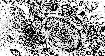 小叶间动脉管壁纤维化,管腔闭塞,内膜有中等量单核细胞浸润,管周组织内也有类似的细胞浸润
