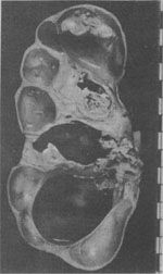 (2)局部性萎缩:乃在某些局部因素影响下发生的局部组织和器官的萎缩。例如动脉硬化症引起的肾萎缩、脑萎缩;长期压迫引起的压迫性萎缩(如肾盂积水时的肾实质萎缩)(图1-16);肢体、器官等长期不活动所致的废用性萎缩(如小儿麻痹症所致的下肢萎缩)以及内分泌和功能低下所至的内分泌萎缩(如Simmond病时,由于垂体功能低下引起的甲状腺、肾上腺、性腺等器官的萎缩),等等。