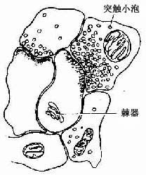 1.突触扣结内有圆形清亮小泡,内含乙酰胆碱