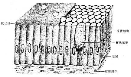 3.单层柱状上皮 单层柱状上皮(simple columnar epithelium)由一层棱柱状细胞组成。从表面看,细胞呈六角形或多角形;由上皮垂直切面看,细胞呈柱状(图2-3),细胞核长圆形,多位于细胞近基底部。此种上皮大多有吸收或分泌功能 。在小肠和大肠腔面的单层柱状上皮中,柱状细胞间有许多散在的杯状细胞(goblet cell)(图2-3)。杯状细胞形似高脚酒杯,细胞顶部膨大,充满粘液性分泌颗粒,基底部较细窄。胞核位于基底部,常为较小的三角形或扁圆形,染色质浓密,着色较深。杯状细胞是一种腺细胞,分泌粘液,有滑润上皮表面和保护上皮的作用。