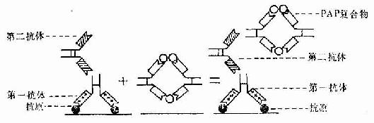 标记抗体民被检抗原的结合方式有两种。一是直接法,即如上述用标记抗体与样品中的抗原直接结合(图1-8)。这种方法操作简便,但敏感度不及间接法。间接法是将分离的抗体(第一抗体简称一抗)再作为抗原免疫另一种动物,制备该抗体(抗原)的抗体(第二抗体简称二抗),再以标记物标记二抗。先后以一抗和标记二抗处理样品,最终形成抗原一抗-标记二抗复合物(图1-8)。间接法中的一个抗原分子可通过一抗与多个标记二抗相结合,因此它的敏感度较高,而且目前国内外均有多种标记二抗商品供应,使用方便。间接法中较常用的是一种称之为过氧化物酶-抗过氧化物酶复合物法(peroxidase-antiperoxidase complex method,PAS法),该法除需一抗和二抗外,还需制备HRP标记的抗酶抗体,即以HRP作为抗原免疫动物,制成抗HRP抗体,再以HRP标记该抗体制成由3个酶分子与2个抗酶抗体组成的相当稳定的环形PAP复合物。标本先后以一抗、二抗和PAP复合物处理后,再以DAB显色,即可检测抗原的分布。此法由于细胞内的抗原通过抗体的层层放大而与多个酶分子结合,因此敏感性很强(图1-9)。