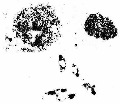 因表达。其基本原理是根据两条单链核苷酸互补碱基序列专一配对的特点,应用已知碱基序列并具有标记物的RNA或DNA片段即核酸探针(probe),与组织切片或细胞内的待测核酸(RNA或DNA片段)进行杂交,通过标记物的显示,在光镜或电镜下观察目的mRNA或DNA的存在与定位。此项技术需首先制备某种核酸探针,其种类主要有三种:①利用大肝杆菌重组带有目的基因的质粒DNA,制成互补DNA探针(cDNA);②应用限制性核酸内切酶消化制成线性DNA模板,在体外转录获得反意RNA探针(cDNA);③依照待测核酸的核苷酸序列,应用DNA合成仪合成寡聚核苷酸探针。cRNA和cDNA的常用标记物有32S、32P、3H等放射性核素和荧光素、生物素、地高辛等非放射性物质。组织学应用的原位杂交术主要是染色体原位杂交和细胞原位杂交。前者是研究遗传基因、抗原基因、受体基因、癌基因等在染色体上的定位与表达;后者是研究细胞某种蛋白质的基因转录物mRNA在胞质内的定位与表达(图1-7,1-12)。核酸分子杂交术有很高的敏感性和特异性,它是免疫细胞化学的基础上,进一步从分子水平探讨细胞功能的表达及其调节机制的,已成为当前细胞生物学、分子生物学研究的重要手段。