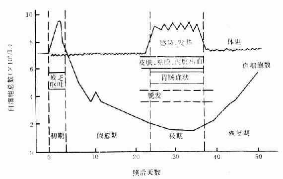 血象变化:照后数小时至2天,白细胞可升高至10×109/L以上,然后下降。淋巴细胞绝对值在照后12~24小时内明显减少,其减少程度与照射剂量有关。
