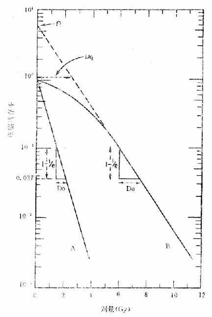 Dq称拟阈剂量(quasithreshold dose),是在剂量存活曲线上存活率为1处划一横坐标的平行线,与B线直线部分延长线相交,其所对应的剂量即为Dq。在A线上Dq=0,故D37=D0。
