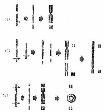 2.染色单体型畸变:当染色体复制之后受照射(即细胞处于S期后期或G2期受照射),在一个染色单体臂上发生断裂或裂隙,称为染色单体型畸变(chromatid aberration)。单体断片、单体互换等属这一类。