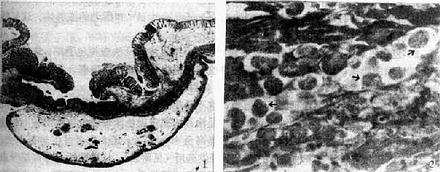 由囊后滋养体增殖的虫体群大多在回盲部或少数在乙状结肠引起原发病灶。除重症者外,原发灶仅局限于粘膜层,肠窥镜观察为稍隆起的充血小灶,中央常有针尖状溃破口。无细菌伴发感染时周围无明显炎症反应。在急性病例,增殖的滋养体能突破粘膜肌层,在疏松的粘膜下层繁殖扩展,引起液化坏死灶,形成口小底大的烧瓶样溃疡。在溃疡处可查见滋养体(图10-3)。溃疡间的粘膜常正常,甚至与机体的修复机制并存,这与菌痢引起的弥漫性病灶迥然不同。继发溃疡的好发部位以回盲部及乙状结肠最多,结肠的弯曲部分次之。病大小自数毫米至十多毫米不等,若有细菌伴发感染,则镜检可见坏死灶的外围有多量中性粒细胞浸润。重症病例则溃疡可深入肌层,或邻近的溃疡互相融合,致使大片粘膜脱落,因而阿米巴溃疡具有较大穿孔肌层,轻症或亚急性病例的肠壁损害可有粘膜微小溃疡至肉芽肿样溃疡的各种不同类型。慢性病例由于粘膜增生可出现阿米巴肿(amoeboma)。在肠粘膜下层或肌层的阿米巴滋养体可侵入静脉,随血流截留于肝窦,引起继发性阿米巴病。初起为多发性坏死小灶,与病灶外围的白细胞浸润构成肝炎期。根据宿主的机体状况,其中的一个或偶尔多个小灶融合而发展为肝脓肿。脓肿的中央为含酱色性状的坏死区,滋养体则聚集在炎症病灶外围与正常组织交界的部位(脓肿壁)。大的肝脓肿可发展至婴儿头颅大小。此外痢疾阿米巴也可经血路或直接经膈向胸腔穿破入肺而致肺脓肿;侵入纵隔、心包甚至脑、脾等部位引起局部脓肿,但甚为少见。肝脓肿腹壁穿孔部位,手术切口或会阴附近的皮肤也可被侵袭而发生阿米巴皮肤溃疡;如累及生殖器官则可引起阿米巴性阴道炎或前裂腺炎等。