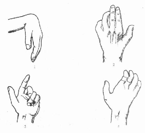 1.垂腕(桡神经);2 .“爪形手”(尺神经);3.正中神经损伤时的手形;