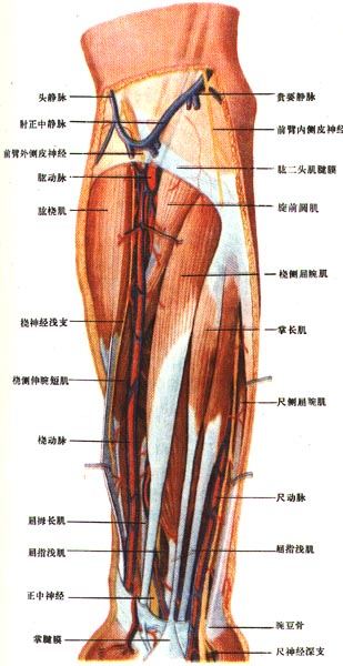 臂和前臂前面的皮肤较薄,移动性大,浅筋膜薄而松弛,内含两条重要的浅静脉和多条皮神经。