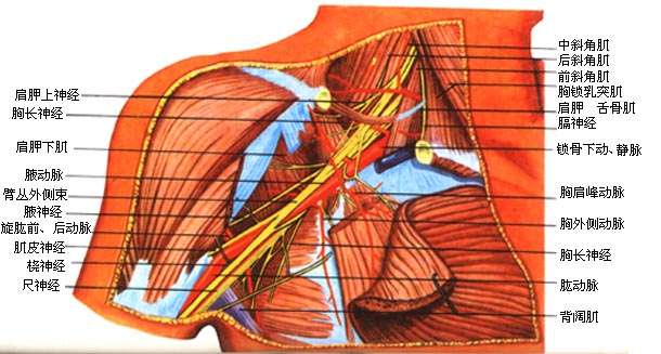 腋区皮肤和浅筋膜的深部,为一尖朝向内上方的四菱锥体形腔隙,叫做腋腔axillarycavity由胸廓及臂部的肌肉围成,内充以疏松结缔组织、淋巴结等,是颈部与上肢血管神经的通路(图5-5)。