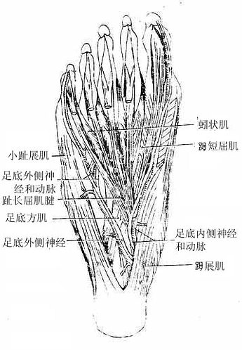 (五)足底深支deep plantar artery 为足背动脉较大的终支,穿第一骨间背侧肌的两头之间至足底,与足底外侧动脉吻合,形成足底弓。