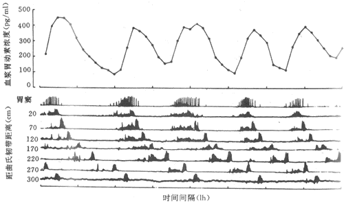 图6-23狗小肠消化间期的移行性运动综合波及其与血浆胃动素浓度的密切关系