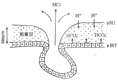 长期以来人们一直在思索:胃粘膜处于高酸和胃蛋白酶的环境中,为什么不被消化?近年来“粘液-碳酸氢盐屏障”概念的提出,至少部分地回答了这个问题。这主要是因为。胃粘液的粘稠度约为水的30-260倍,H+和HCO3等离子在粘液层内的扩散速度明显减慢,因此,在胃腔同内的H+向粘液凝胶深层弥散过程中,它不断地与从粘液层下面的上皮细胞分泌并向表面扩散的HCO3遭遇,两种离子在粘液层内发生中和。用pH测量电极测得,在胃粘液层存在一个pH梯度,粘液层靠近胃腔面的一侧呈酸性,pH为7左右(图6-14)。因此,由沾液和碳酸氢盐共同构筑的粘液-碳酸氢盐屏障。能有效地阻挡H+的逆向弥散,保护了胃粘液免受H+的假侵蚀;粘液深层的中性pH环境还使胃蛋白酶丧失了分解蛋白质的作用。