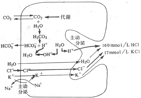 已知壁细胞内含有丰富的碳酸酐酶,在它的催化下,由细胞代谢产生的CO2和由血浆中摄取的CO2可迅速地水合而形成H2CO3,H2CO3随即又解离为H+和HCO3。这样,在H+分泌后,留在细胞内的OH-便和由