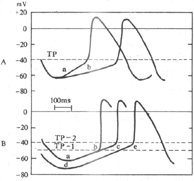 B:最大复极电位水平由a达到d,或阈电位由TP-1升到TP-2时,自律性均降低 Tp :阈电位
