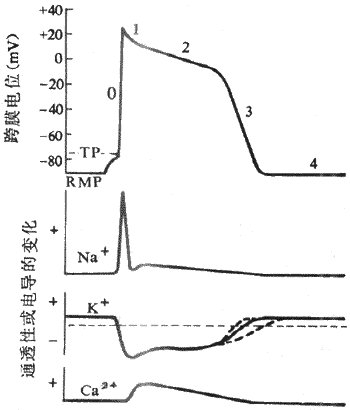 (2)复极过程:当心室细胞除极达到顶峰之后,立即开始复极,但整个复极过程比较缓慢,包括电位变化曲线的形态和形成机制均不相同的三个阶段: