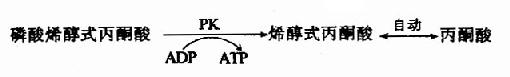 在丙酮酸激酶(pyruvate kinase,PK)催化下,磷酸烯醇式丙酮酸上的高能磷酸根转移至ADP生成ATP,这是又一次底物水平上的磷酸化过程。但此反应是不可逆的。