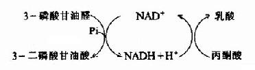 氧供应不足时从糖酵解途径生成的丙酮酸转变为乳酸。缺氧时葡萄糖分解为乳酸称为糖酵解(glycolysis),因它和酵母菌生醇发酵非常相似。丙酮酸转变成乳酸由乳酸脱氢酶(lactate dehydrogenase)催化丙酮酸乳酸脱氢酶乳酸在这个反应中丙酮酸起了氢接受体的作用。由3-磷酸甘油醛脱氢酶反应生成的NADH+H+,缺氧时不能经电子传递链氧化。正是通过将丙酮酸还原成乳酸,使NADH转变成NAD+,糖酵解才能继续进行。