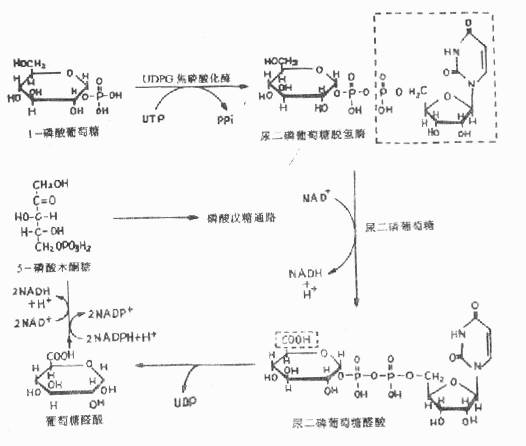 糖醛酸代谢(uronic acid metabolism)主要在肝脏和红细胞中进行,它由尿嘧啶核苷二磷酸葡萄糖(UDPG)上联糖原合成途径,经过一系列反应后生成磷酸戊糖而进入磷酸戊糖通路,从而构成糖分解代谢的另一条通路。