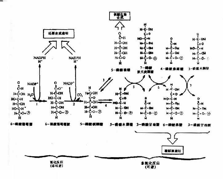 磷酸戊糖途径(pentose phosphate pathway)又称已糖单磷酸旁路(hexose monophosphate shut HMS)或磷酸葡萄糖旁路(phosphogluconate shut)。此途径由6-磷酸葡萄糖开始生成具有重要生理功能的NADPH和5-磷酸核糖。全过程中无ATP生成,因此此过程不是机体产能的方式。其主要发生在肝脏、脂肪组织、哺乳期的乳腺、肾上腺皮质、性腺、骨髓和红细胞等。