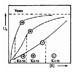 (1)一般变构酶分子上有二个以上的底物结合位点。当底物与一个亚基上的活性中心结合后,通过构象的改变,可增强其他亚基的活性中心与底物的结合,出现正协同效应(positivecooperative effect)。使其底物浓度曲线呈S形。即底物浓度低时,酶活性的增加较慢,底物浓度高到一定程度后,酶活性显著加强,最终达到最大值Vmax(图2-20)。