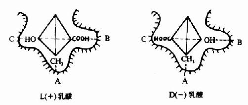 L(+)乳酸通过其不对称碳原子上的桟H3、桟OOH及桹H基分别与乳酸脱氢酶活性中心的A、B及C三个功能基团结合,故可受酶催化而转变为丙酮酸。而D(-)乳酸由于桹H、桟OOH的空间位置与L(+)乳酸相反,与酶的三个结合基团不能完全配合,故不能与酶结合受其催化(图2)。由此可见,酶的特异性不但决定于酶活性中心的功能基团的性质,而且还决定于底物和活性中心的空间构象,只有那些有一定的化学结构,能与酶的结合基团结合,而且空间构型又完全适应的化合物,才能作为酶的底物。