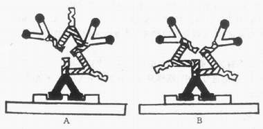理论上讲,双桥法是ICC染色中较为敏感的方法,它较单桥法灵敏20~50倍,能够增加抗原的显示数量(25%)和反应终产物的大小。这在研究胚胎发育过程中一些抗原含量较低的组织时,具有一定的应用价值。双桥法可能是通过下列途径提高其敏感性的:①重复的桥抗体与PAP复合物中的抗HRP抗体的未饱和抗原位置结合,再连结另外的PAP复合物,在抗原部位抗体间彼此结合形成较大的抗原抗体复合物,具有多个酶分子(图4-9A),使反应增强。这可能是双桥法敏感性增高的主要机制;②重复的桥抗体与第一抗体未饱和的抗原位置结合,使第一抗体上结合较多的桥抗体及PAP复合物(图4-9B)。但PAP复合物较大,应设法提高其穿透性,达到增加染色强度的目的。