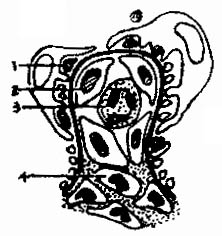 图4-2-4 毛细血管内增殖性肾小球肾炎模式图。上皮细胞下电子致密物(免疫复合物)沉积,内皮细胞和系膜细胞增殖,白细胞浸润1.上皮下沉积物2.内皮细胞 3.白细胞 4.系膜细胞