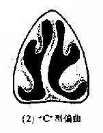 (四)检查:鼻中隔软骨部偏曲诊断较易,高位或后段偏曲易被忽视。本病必须与鼻中隔粘膜肥厚相鉴别,以探针触之,后者柔软,且易压成小凹。检查时可见鼻中隔偏曲的各种类型(图4-5),按偏曲形态分类,有“C”型、“S”型、嵴和距状突等。按偏曲部位分类,则有高位、低位、前段、后段之别。
