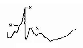 2.耳蜗电图描记法(electrocochleography):所测得的耳蜗电图(electrocochleogram,ECochG)为目前测试耳蜗病变最准确的方法。平时耳蜗中阶内有跨越毛细胞顶部的140mv的电位差(静息电位),声音刺激下,声波自前庭窗传入耳蜗,引起基底膜的运动,致使外毛细胞的纤毛由于剪刀式运动而被弯曲,形成毛细胞顶部局部电流的变化,使机械能转换成电能,在内耳产生三种电反应:耳蜗微音电位(cochlear-microphonics potential,CM)、和电位(summating potential,SP)和听神经综合动作电位(compound action potential,AP)。CM为来自毛细胞的一种耳蜗电位,亦称感受器电位,这种交流连续电位,无潜伏期,可如实反映声刺激的声学波形,无真正阈值。SP是声波传入内耳基底膜非线性振动而引起的耳蜗直流电位,为多种成分的反应,不单独用,常与AP结合应用。AP为许多蜗神经纤维兴奋时发出冲动的综合电位,其典型波形有N1、N2两个负峰(图2-33)。N1来自耳蜗神经,潜伏期约2ms,N2可能包括耳蜗核的反应,为耳蜗电图的重要观察指标。观察项目包括对刺激声的电反应阈值、潜伏期、最大幅度值、电反应波振幅/声强度与潜伏期/声强度(输入、输出函数曲线)。